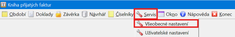 V hlavním menu vyberte „Servis“, v kontextovém menu „Všeobecná nastavení“, ve formuláři vyberte záložku „Schvalování faktur“.