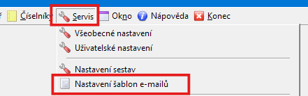V hlavním menu vyberte „Servis“, v kontextovém menu zvolte „Nastavení šablon e-mailů“.