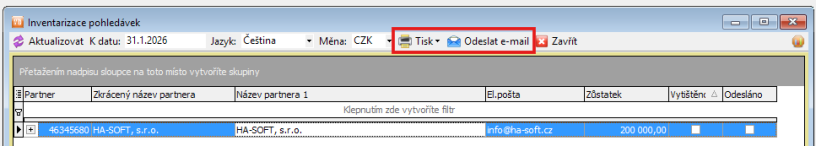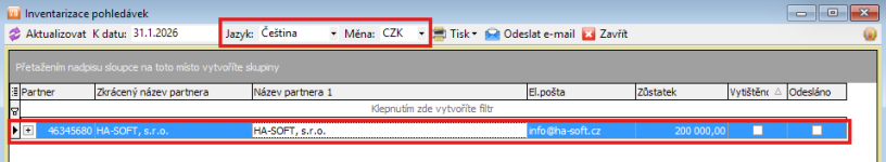 Dále proveďte nastavení jazyka partnera (pokud máte i zahraniční partnery). Inventarizaci pohledávek můžete vytisknout a zaslat poštou nebo poslat e-mailem.