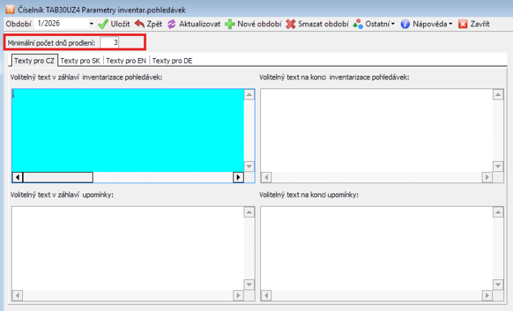 V číselníku TAB30UZ4 nastavíte texty do tiskopisu inventarizace pohledávek i upomínek. Můžete zde nastavit: