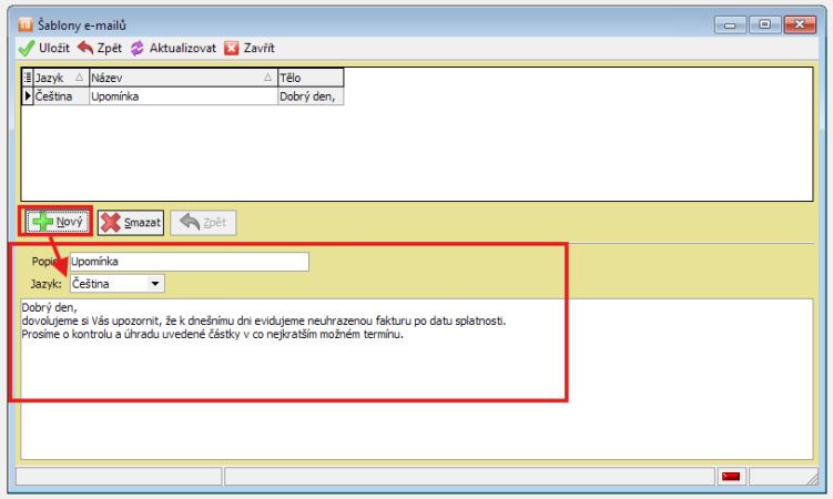 Pro vytvoření nové šablony klikněte na „Nový“, vyplňte kolonku „Popis“ a zvolte jazyk textu. Text e-mailu napište podle standardů vaší společnosti, včetně podpisu. Nastavení uložte.