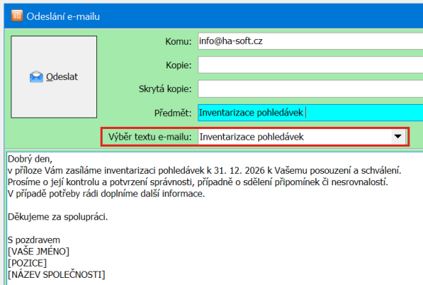 Pro zaslání e-mailem: Klikněte na „Odeslat e-mail“. E-mail partnera se doplní automaticky, pokud je u něj nastaven v číselníku TAB73S. Text e-mailu zvolte z uložených možností v kolonce „Výběr textu e-mailu“, případně jej doplňte ručně (nový řádek vložíte pomocí zkratky Ctrl+Enter).